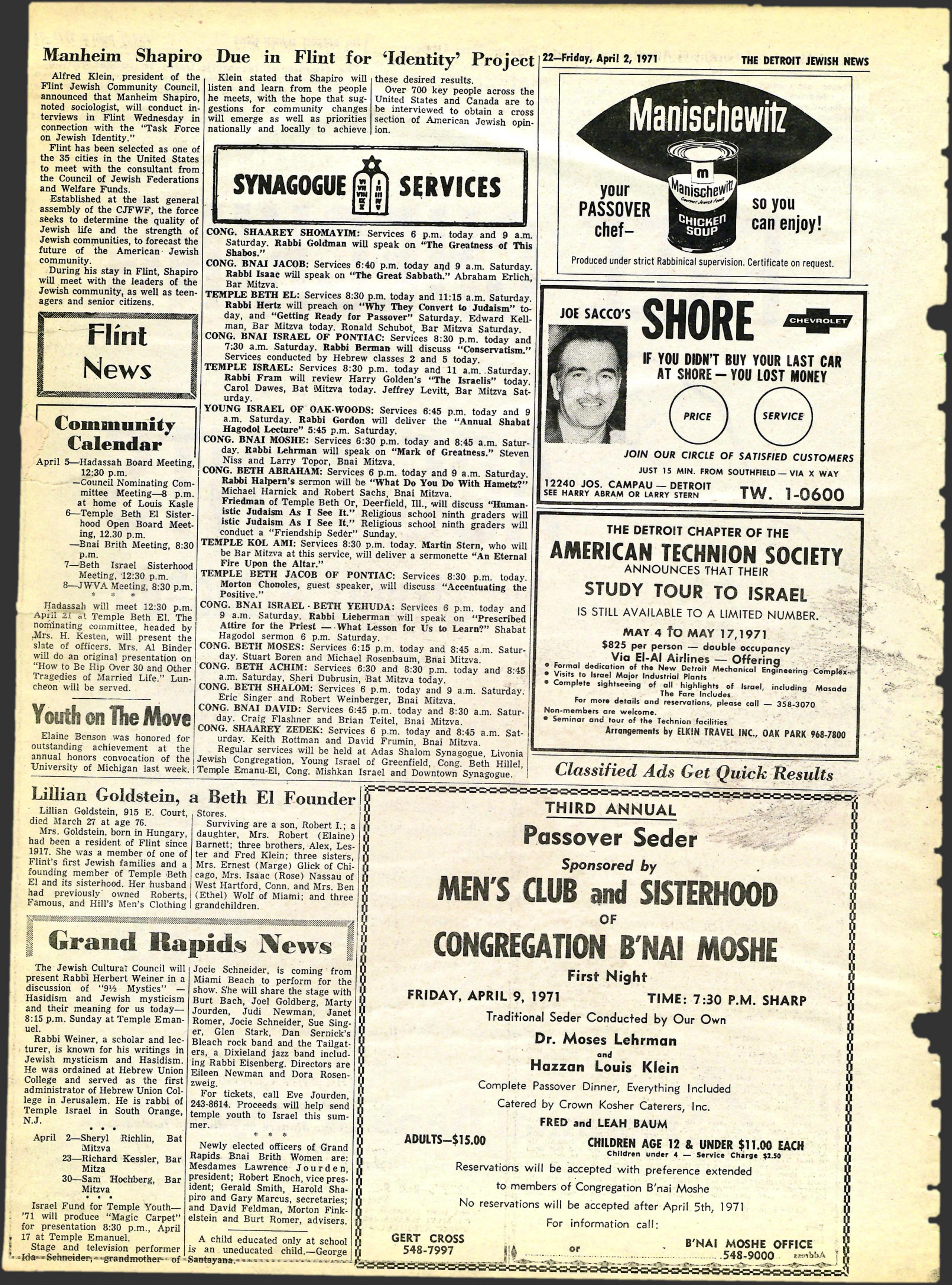 CONG. BNAI MOSHE: Services 6:30 p.m. today and 8:45 a.m. Satur-