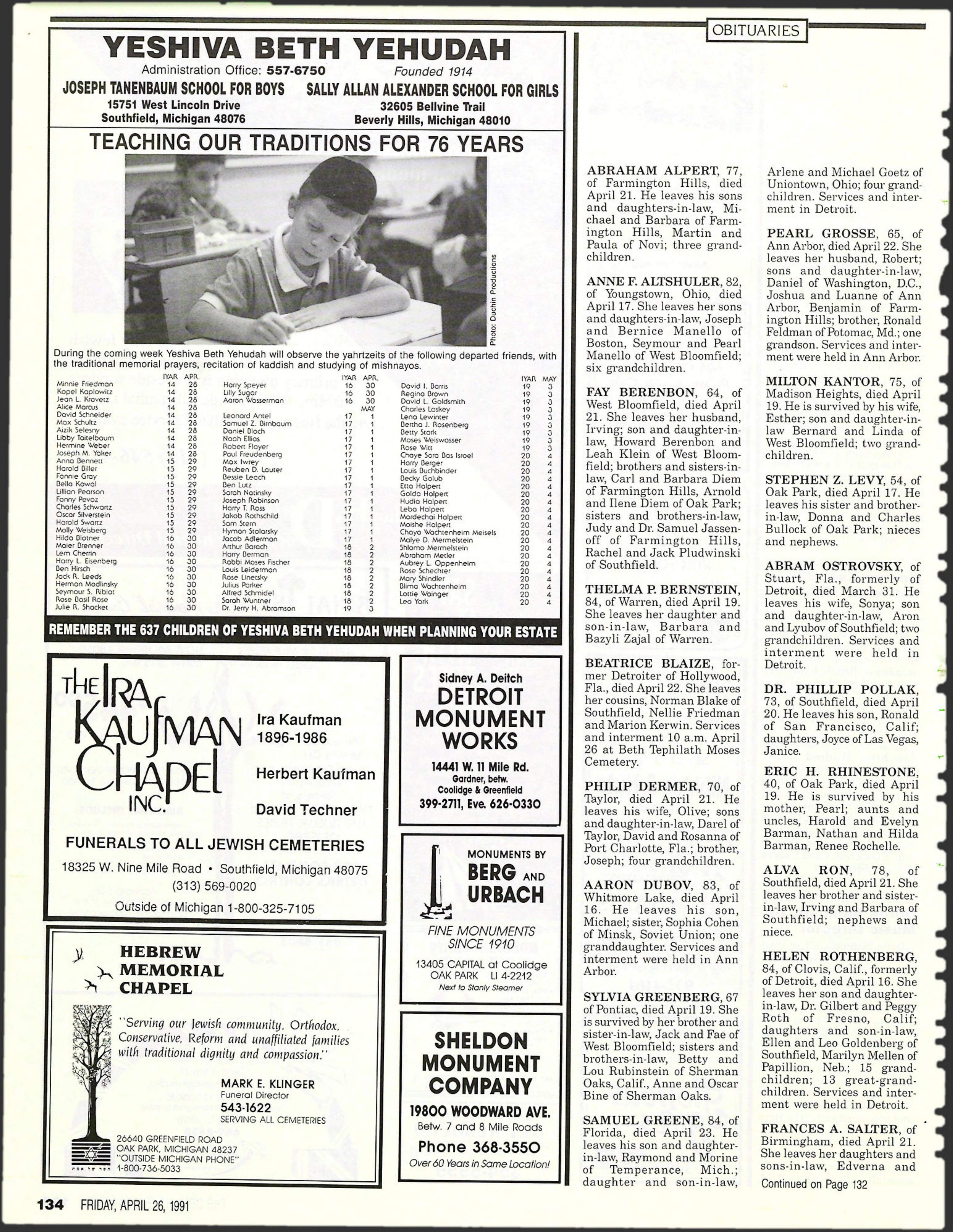 During the coming week Yeshiva Beth Yehudah will observe the yah rtzeits of the following departed friends, with