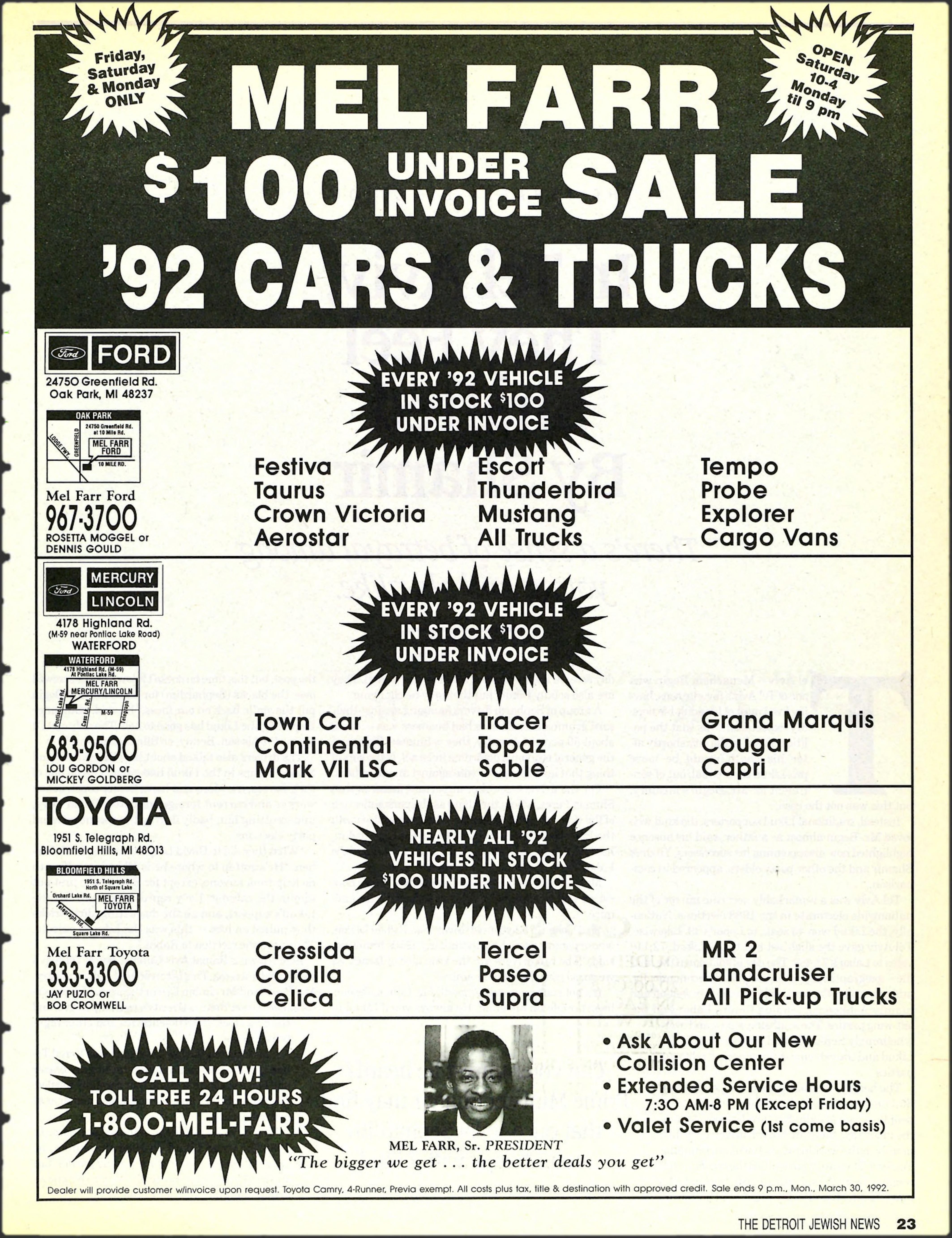 Dealer will provide customer w/invoice upon request. Toyota Camry, 4-Runner, Previa exempt. All costs plus tax, title & destination with approved credit. Sale ends 9 p.m., Mon., March 30, 1992.