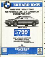 per mile over limit. MSRP of S67,270 . Option to purchase at lease end for S42,380. Total of pymts. = ad price + 6%x30. Offer ends Jan. 31, 1996. Correct 3799.00 X 30 netts equals 323,970.00. 3799'rnxith for the all neN, fully optioned 1995 BMW 710ik