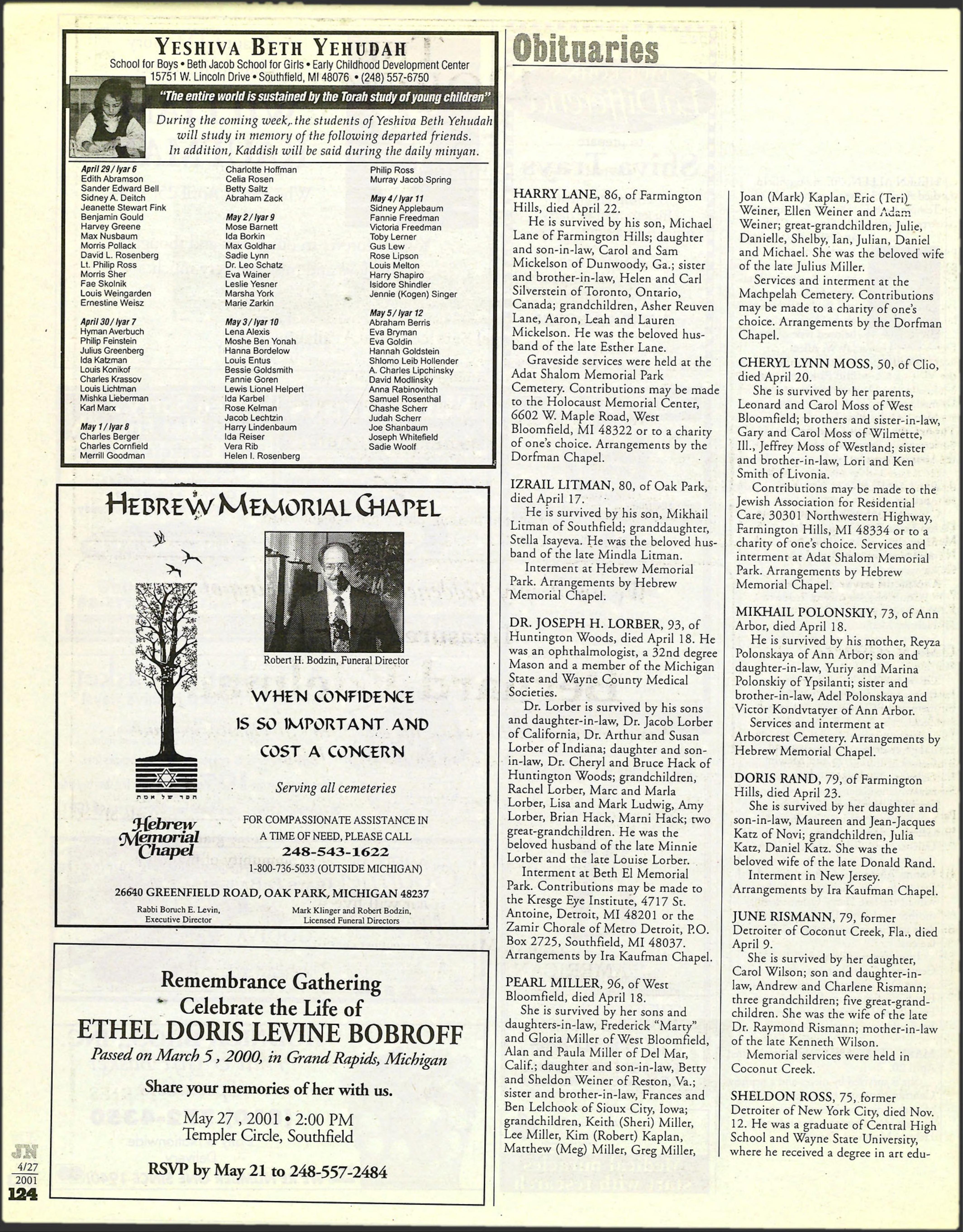 Huntington Woods, died April 18. He