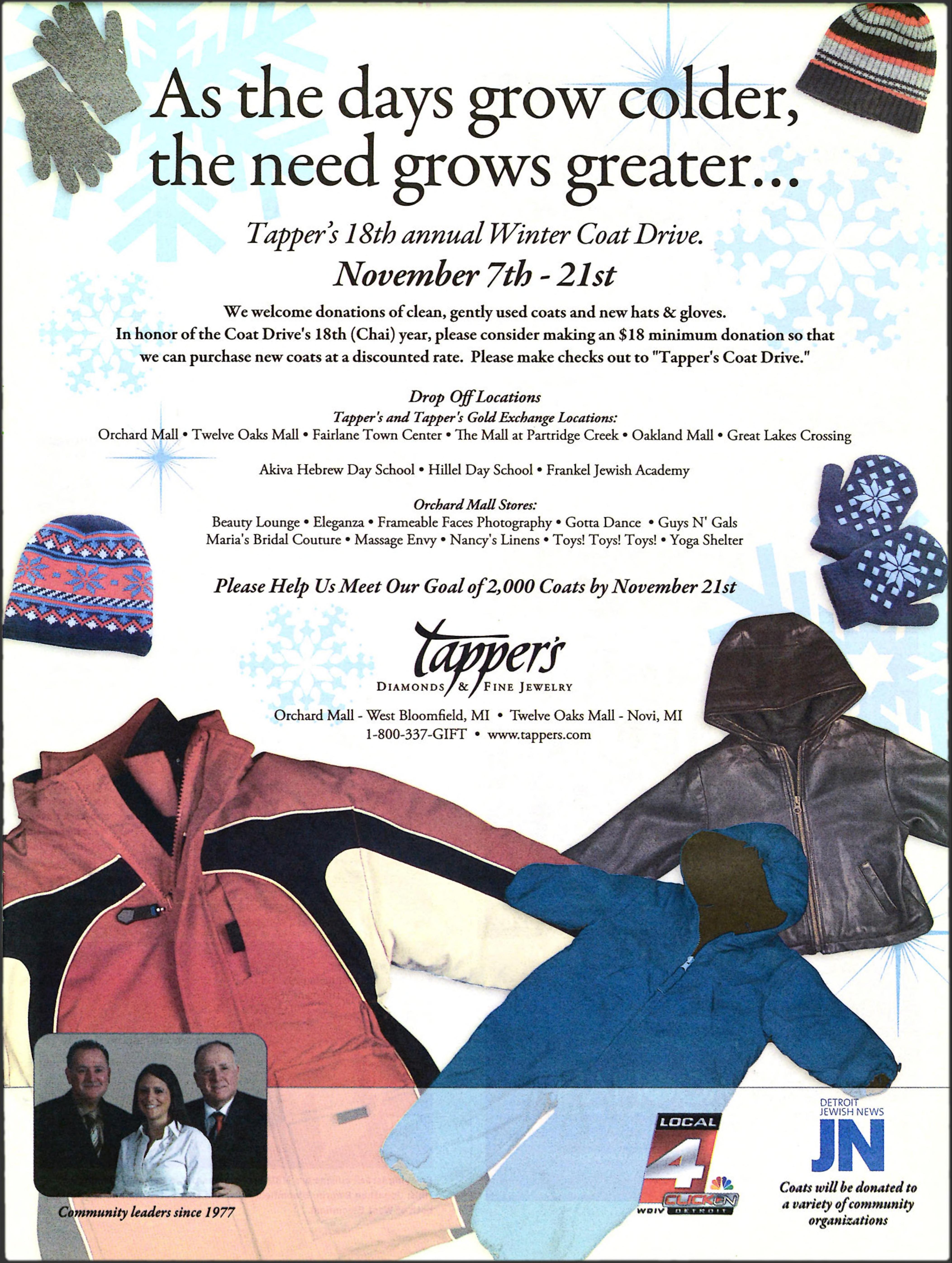 we can purchase new coats at a discounted rate. Please make checks out to "Tapper's Coat Drive."