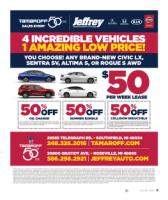 Model # 12119. In stock units only. Expires 7/31/19. 2019 Nissan Altima 2.5 S FWD VIN # 1N4BL4BV6KC231363. $50 per week payment based on 52-week year. Lease $216.67 per month plus tax for 36 months. Two or more units avail-