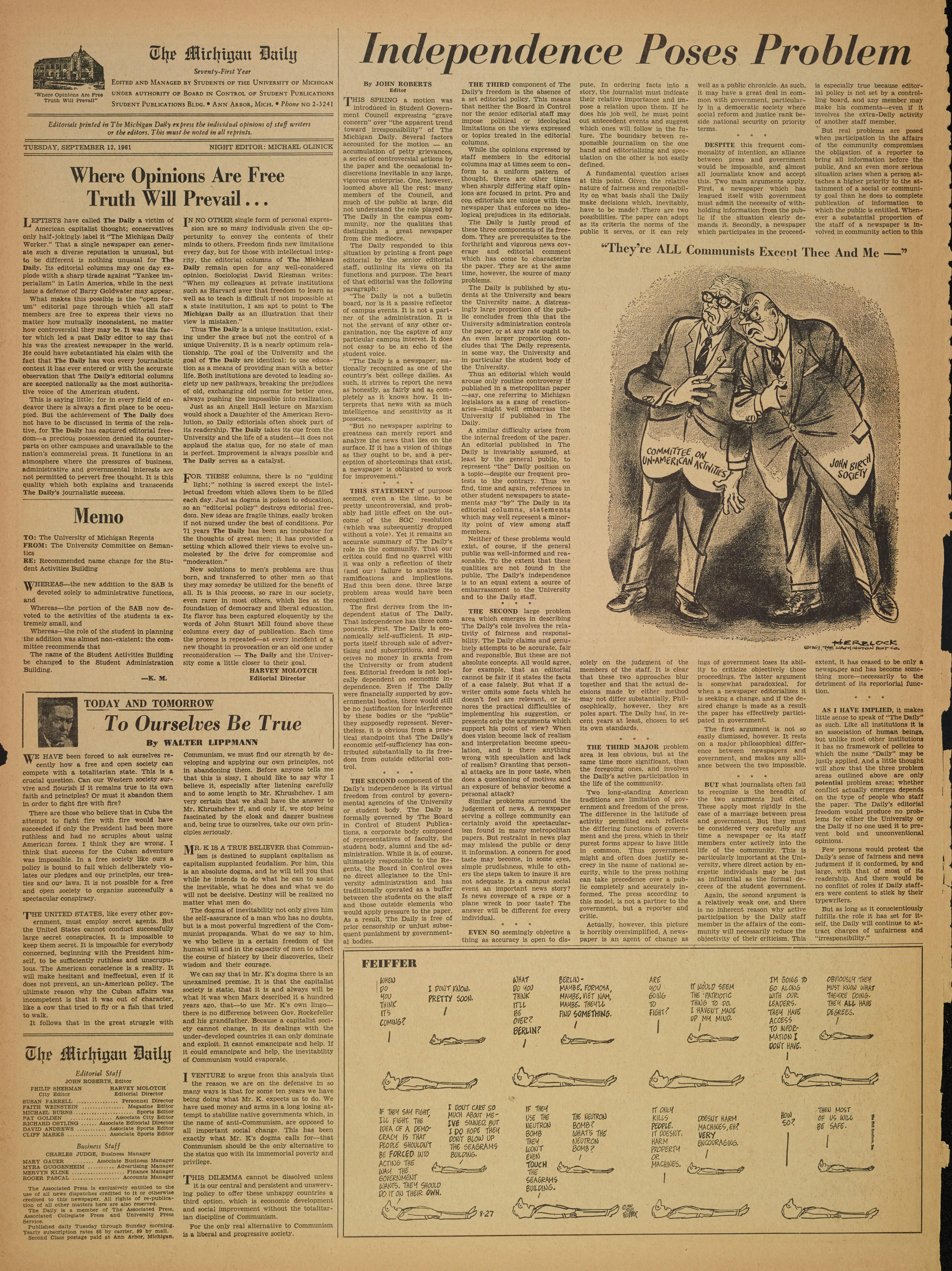 TUESDAY, SEPTEMBER 12, 1961 NIGHT EDITOR: MICHAEL OLINICK