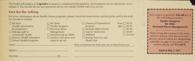For more information about Health Center programs, please check the boxes below and drop this card in the mail. This coupon i