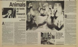 Ducklings like these are immunized, and then antibodies are taken to develop new immunizations. Dr. Ringler (above, left) holds a dog used in cardiovascular studies.