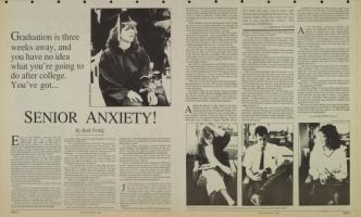 Three atnxious seniors await interviews wiith prospective employers at the Career Planning and Placement Office.