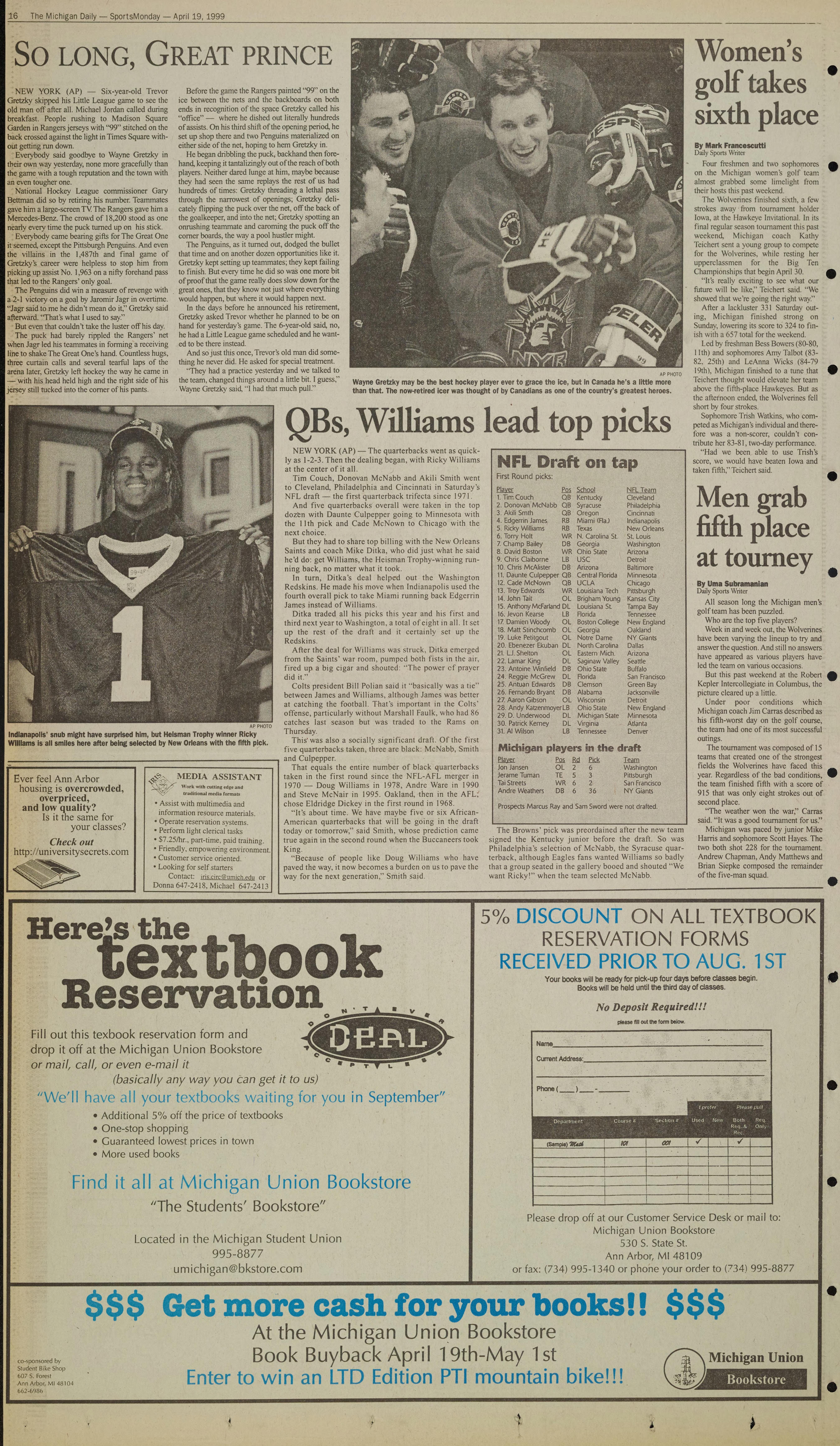 :16 The Michigan Daily - SportsMonday - April 19, 1999
