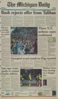 Member of the Michigan cheerleading team lead a crowd at a Homecoming pep rally on the Diag