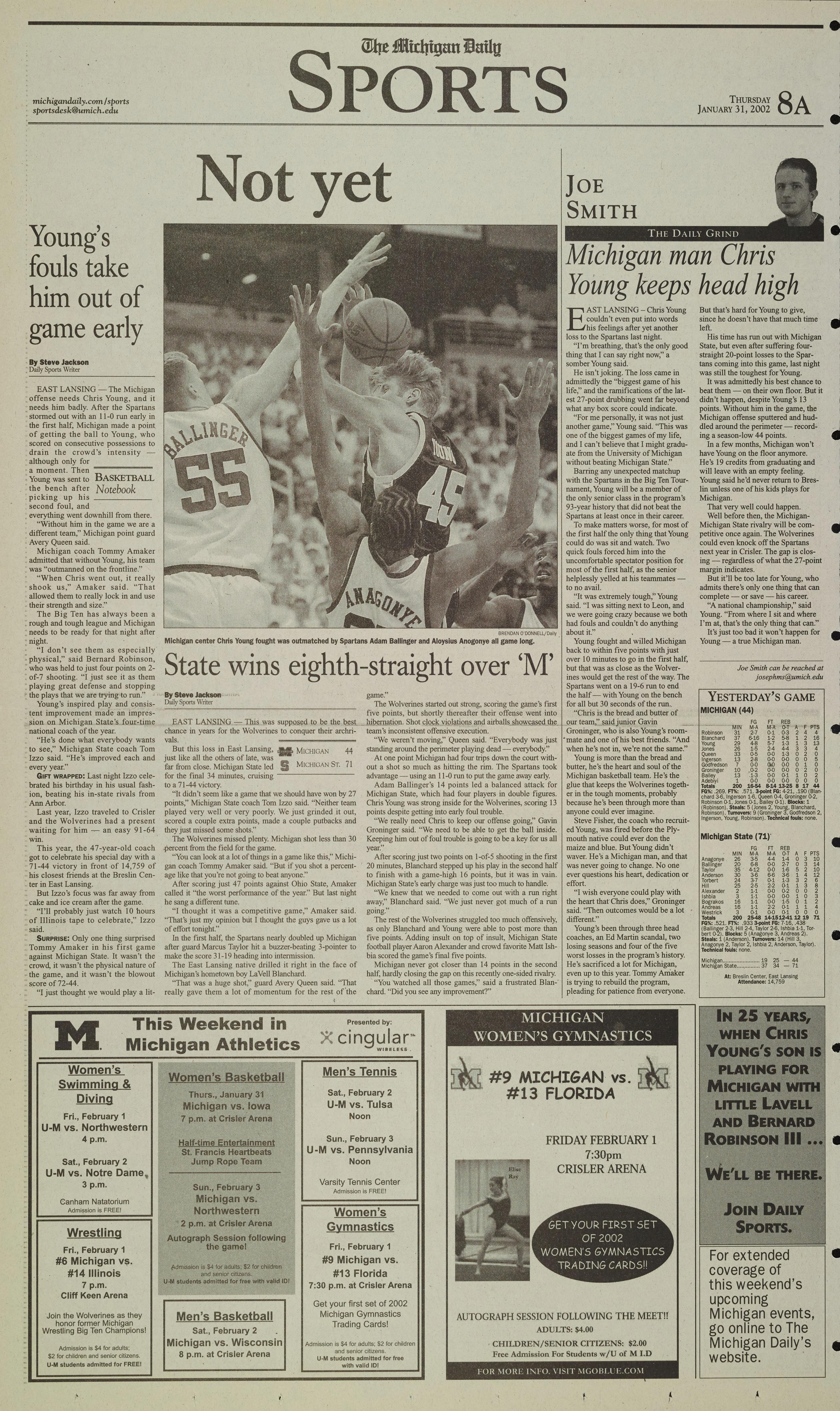 Michigan center Chris Young fought was outmatched by Spartans Adam Ballinger and Aloyslus Anogonye all game long.