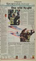 Top: Michigan freshman forward Eric Nystrom celebrates after the Wolverines' 5-3 victory over Denver on Saturday night. Nystrom scored two goals and assisted on captain Jed Ortmeyer's game-winning