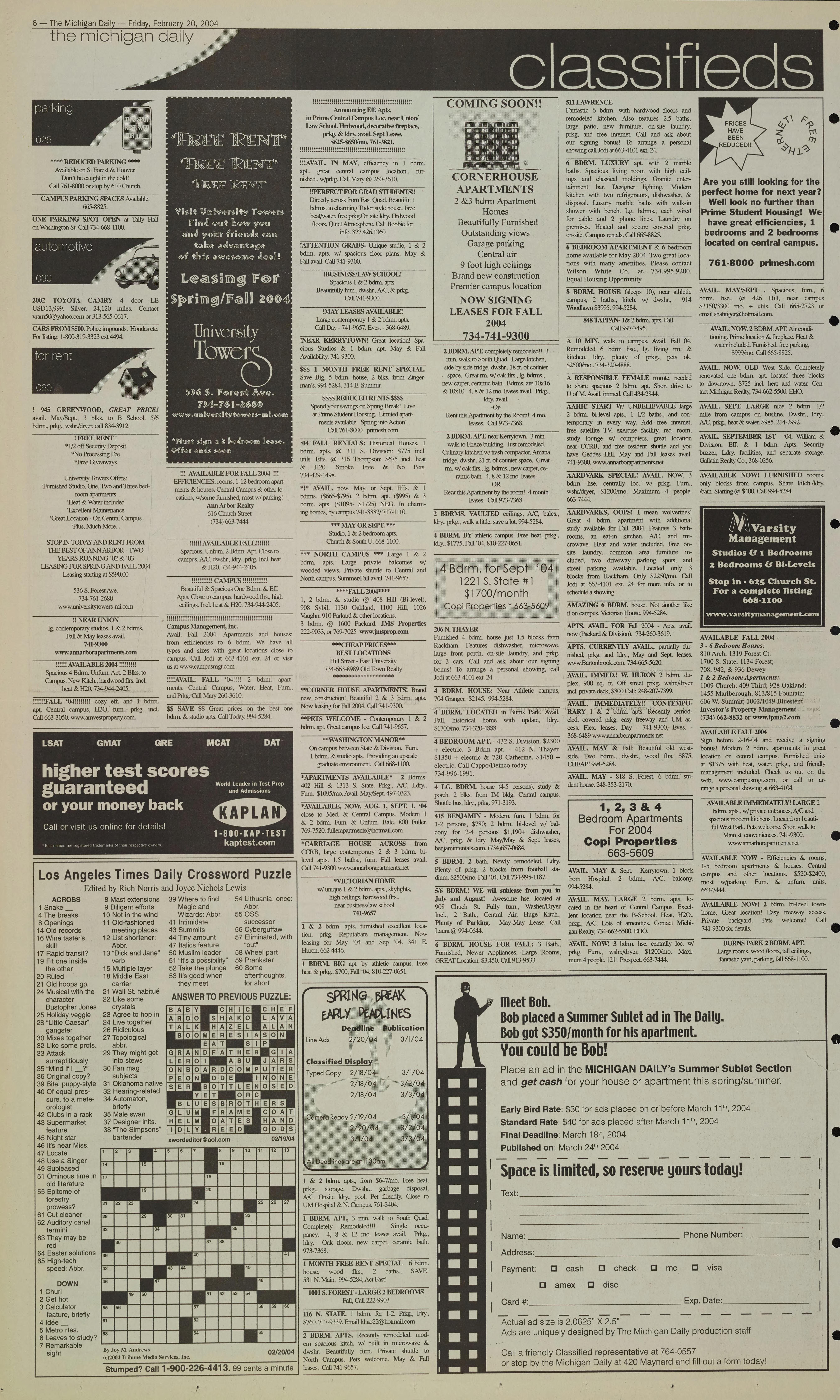 Bob placed a Summer Sublet ad in The Daily.