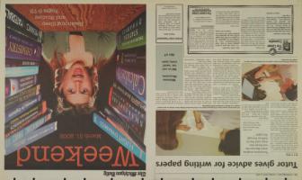 LSA junior Katie Lorenz tutors LSA freshman Adam Lax at the Sweetland Writing Center during the peer mentor