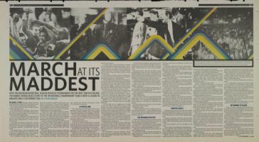 title; Steve Fisher leads the team to the Final Four; students swarm the streets after the championship.
