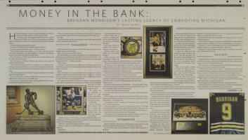 9 Michigan jersey sit along one of the walls. Two pictures of Morrison - one