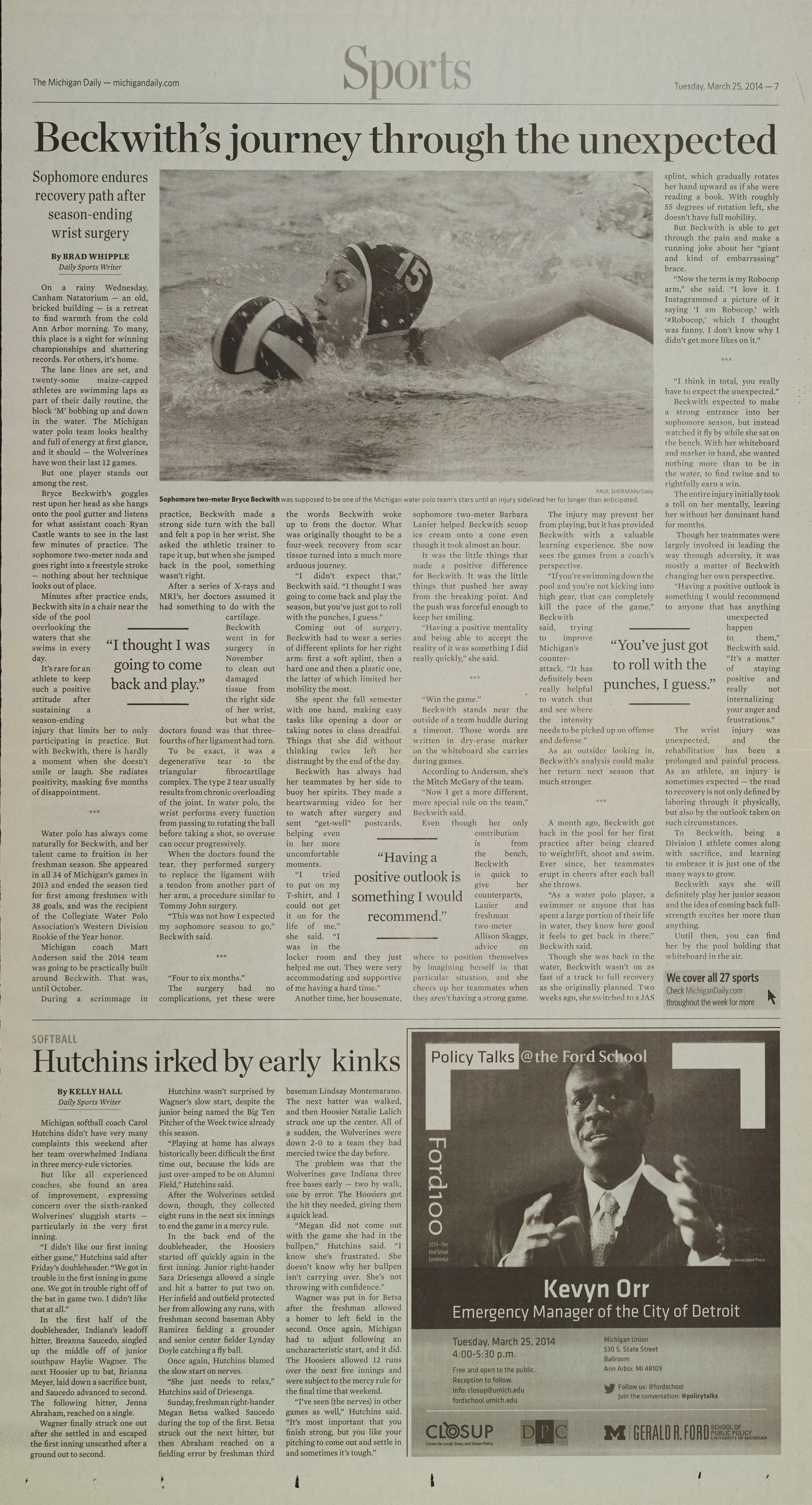 Sophomore two-meter Bryce Beckwith was supposed to be one of the Michigan water polo team's stars until an injury sidelined her for longer than anticipated.
