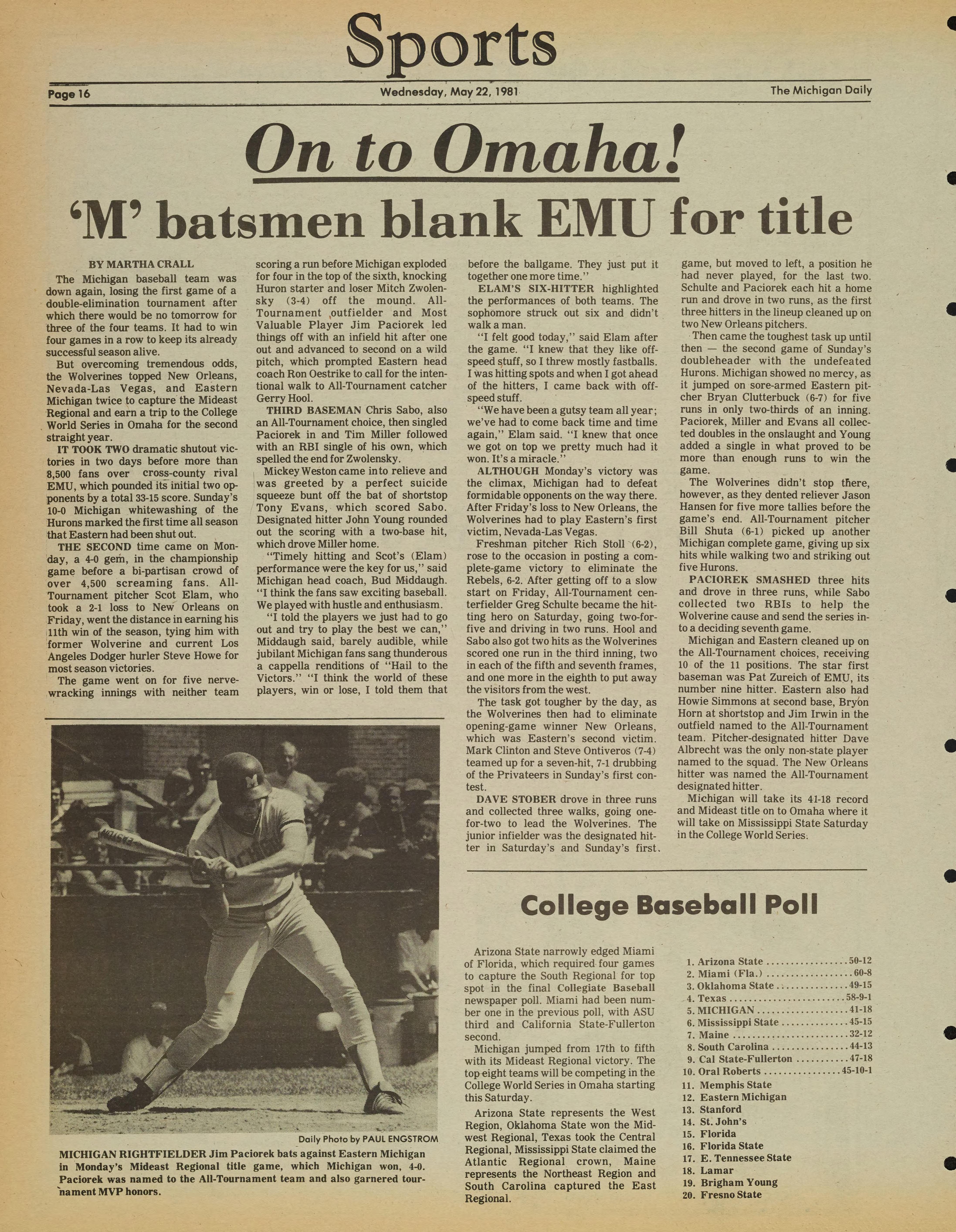 MICHIGAN RIGHTFIELDER Jim Paciorek bats against Eastern Michigan