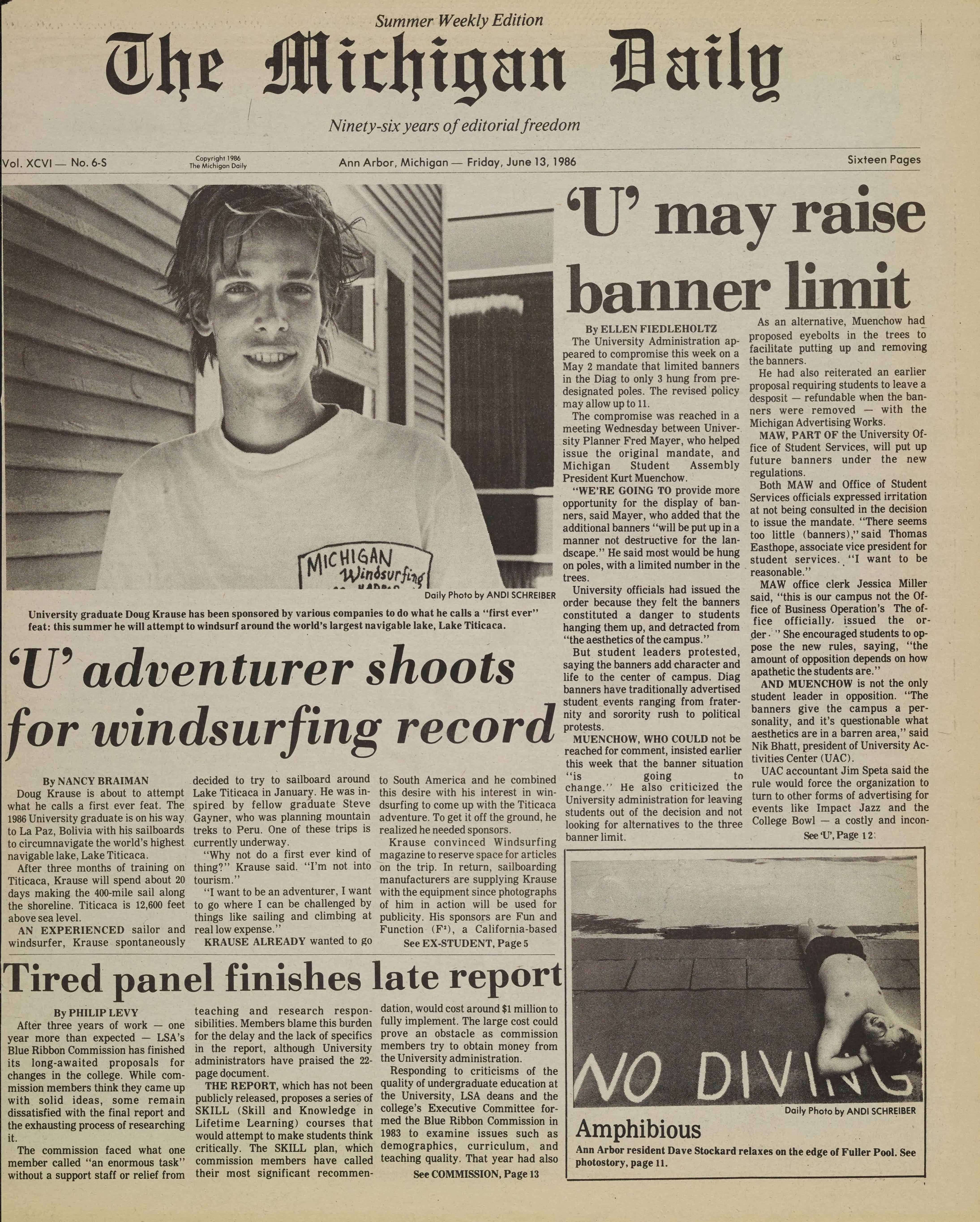 Doug Krause is about to attempt Lake Titicaca in January. He was in- this desire with his interest in win- change. He also criticized the rule oulr for e oranizati for