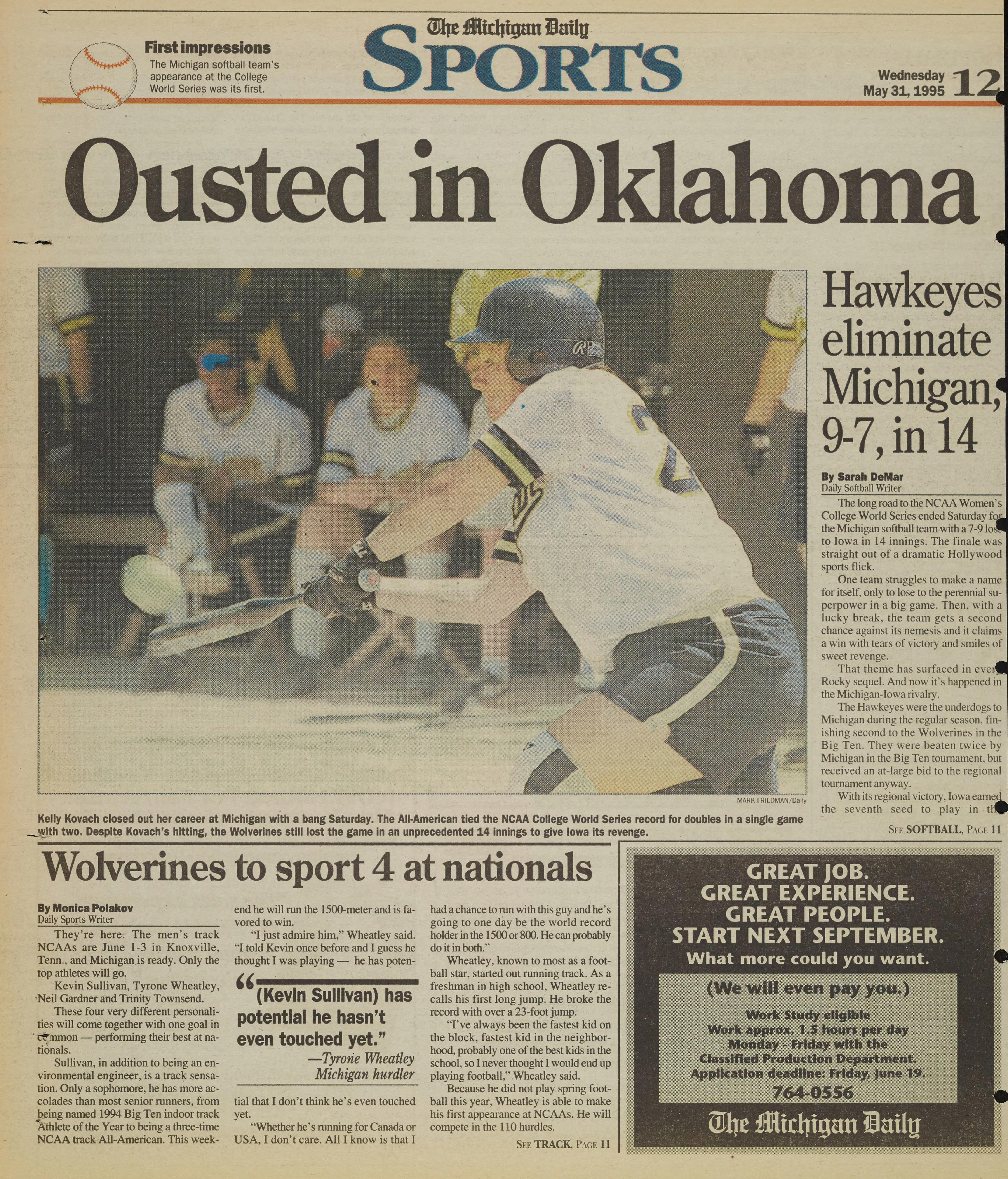 Kelly Kovach closed out her career at Michigan with a bang Saturday. The All-American tied the NCAA College World Series record for doubles in a single game