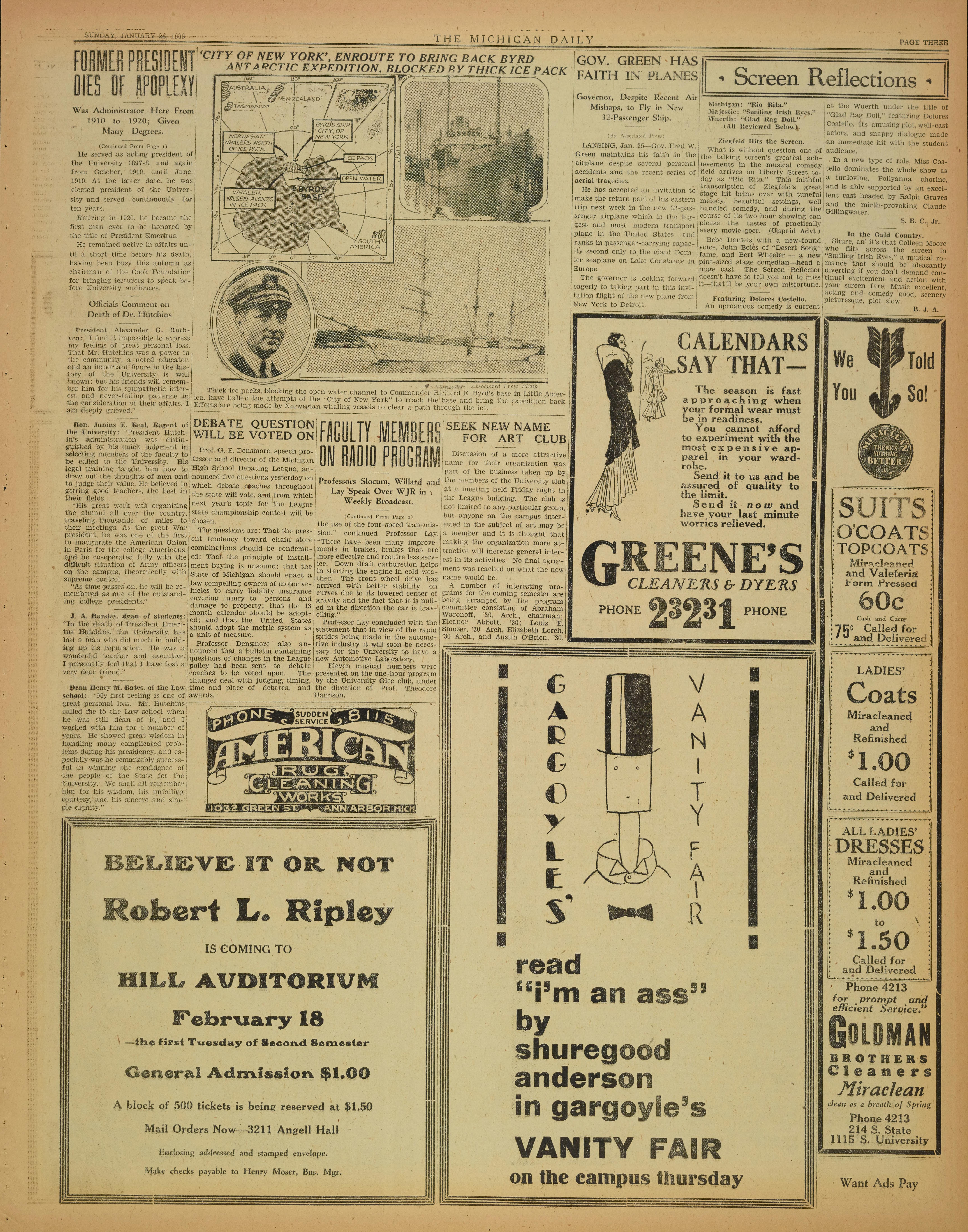 Isar him for his symnpathetic inter- I ,rnck i ce packs, blocking the open water channel to Commander l ith ii d Ft a Byrd'fi .base in Little Amer-,