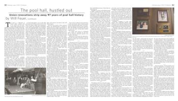 Photos of a visit by Jeanette Lee in 1998, a professional pool player known as “Black Widow,” hang in the bil-